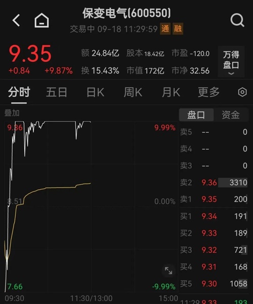 9月18日早盘,国企改革概念人气股保变电气开盘闪崩至跌停后,在大额买单的推动下,公司股价迅速拉升封上涨停板,上演“地天板”行情。