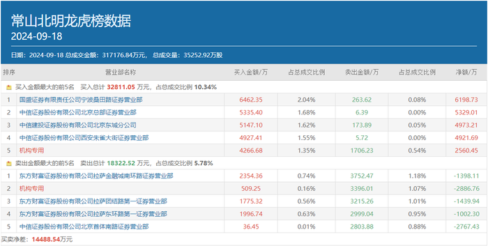 具体来看,宁波桑田路的常用席位国盛证券宁波桑田路以6462.35万元的买入额高居常山北明买方榜首;呼家楼的两大常用席位中信证券北京总部和中信建投证券北京东城分公司分列买方第二和第三位,买入金额分别为5335.4万元和5147.1万元;另有方新侠的常用席位中信证券西安朱雀大街也榜上有名,以4927.41万元的买入额居于买方第四位。