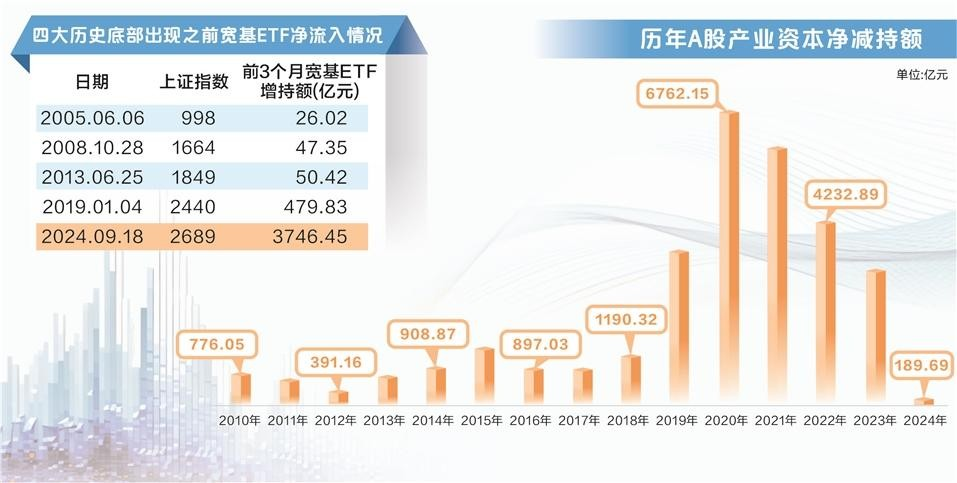 从历史表现来看,在上证指数四大历史底部出现之前,股票型ETF尤其是宽基ETF呈现较强的抄底迹象。据证券时报·数据宝统计,按照ETF成交均价和增持份额粗略计算,2005年、2008年、2013年、2019年四大历史底部出现前3个月内,宽基ETF均呈现资金净流入。在今年股市持续走弱的背景下,宽基ETF再次呈现大量资金净流入。截至2024年9月18日,此前3个月宽基ETF资金净流入3746.45亿元。资金净流入规模远超历史四大底部同期。