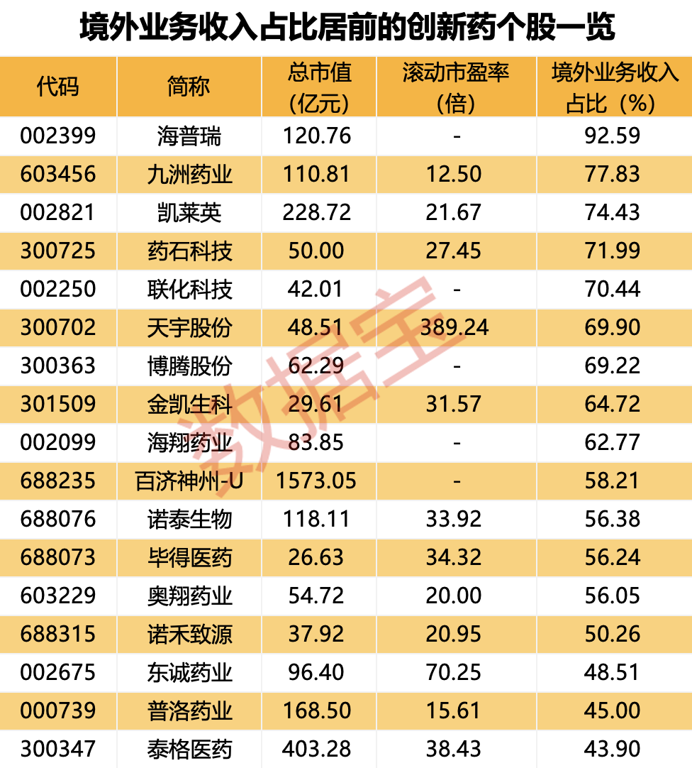 根据上半年业绩报告数据,上半年境外业务收入超20亿元的有8家公司,金额居前的创新药企包含百济神州-U、复星医药、普洛药业、海普瑞、九洲药业等。