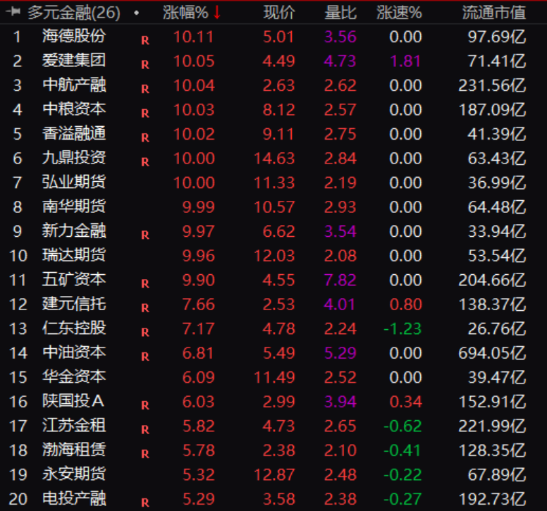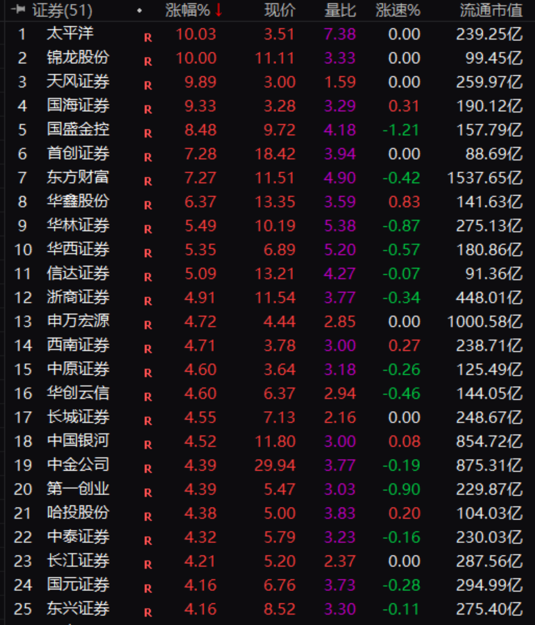 券商股亦是全线大涨,太平洋、锦龙股份涨停,天风证券逼近涨停板,国海证券涨逾9%,国盛金控涨逾8%,首创证券、东方财富涨逾7%。