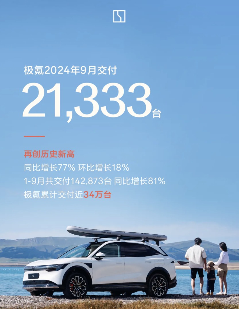 10月1日,极氪官微公布最新交付量:2024年9月交付21333台,同比增长77%,环比增长18%。今年1-9月共交付142873台,同比增长81%。截至9月底,极氪累计交付近34万台,持续刷新交付纪录。