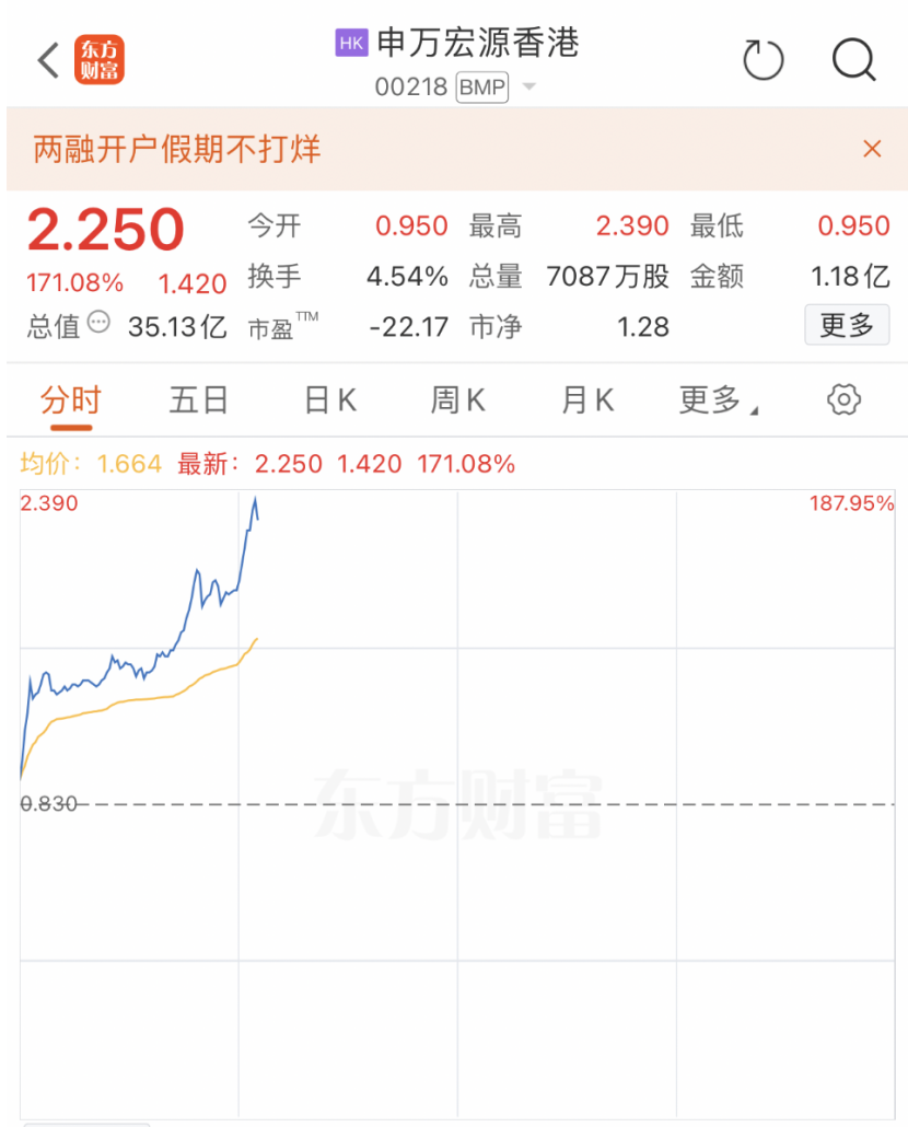 个股方面,申万宏源香港盘中最高暴涨188%,国泰君安国际大涨超40%,中信证券大涨超30%,兴证国际大涨超28%,东方证券大涨超24%,光大证券涨超23%,中国银河涨超19%,中金公司涨超18%。