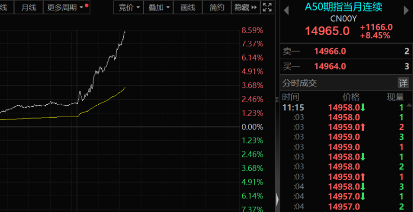 今日,A股继续假期休市,港股正常开市交易,做多资金情绪仍非常高涨。截至11:15,恒指大涨超5%,恒生科技指数大涨超9%,富时中国A50指数期货涨超8%。中国券商H股指数上涨19%,创2016年以来最大涨幅。其中,申万宏源香港盘中最高暴涨188%,国泰君安国际大涨超40%,中信证券大涨超30%。
