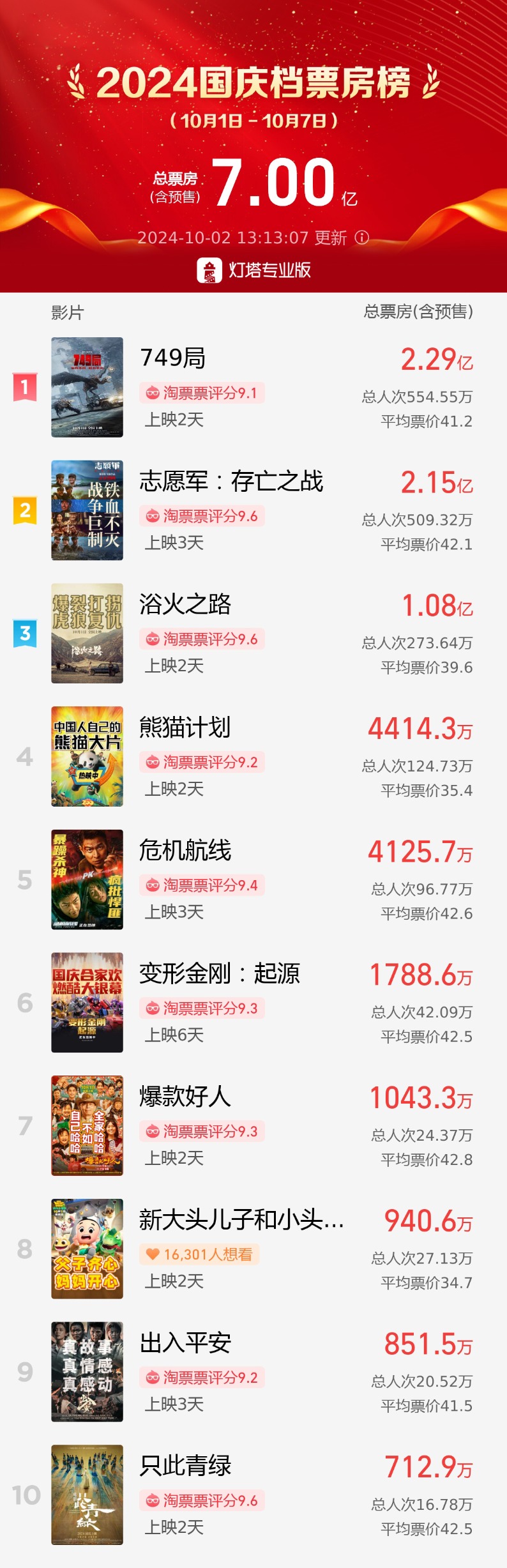 央视新闻10月2日消息,据网络平台数据,截至10月2日13时13分,2024年国庆档(10月1日—10月7日)档期内总票房(含预售)突破7亿。
