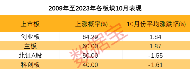 从板块来看,创业板上涨概率最高,其次分别是主板、北证及科创板(注:北证、科创板等开板晚于统计起点年份的,以实际有行情年份进行统计)。以创业板来看,自2010年至2023年,共有9个年度的10月份呈上涨行情,平均涨幅1.84%,其中2015年10月份创业板“牛”冠全球,涨幅高达19%。