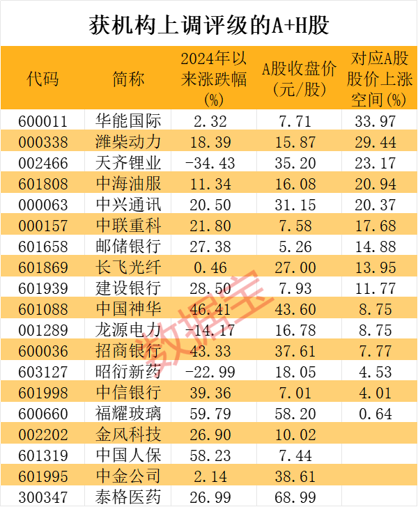 据证券时报·数据宝统计,截至当前,19家H股(A+H股)获机构上调评级,对应15家A股公司的一致预测目标价较最新收盘价有一定上涨空间,华能国际、潍柴动力、天齐锂业、中海油服以及中兴通讯上涨空间超过20%。