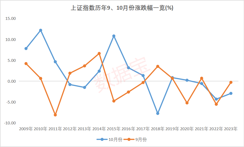 从数据来看,2009年至2023年的过去15年间,上证指数10月份平均涨幅为1.69%,其中有9次上涨,即10月份上涨概率达到60%,仅次于2月份的上涨概率73.33%。