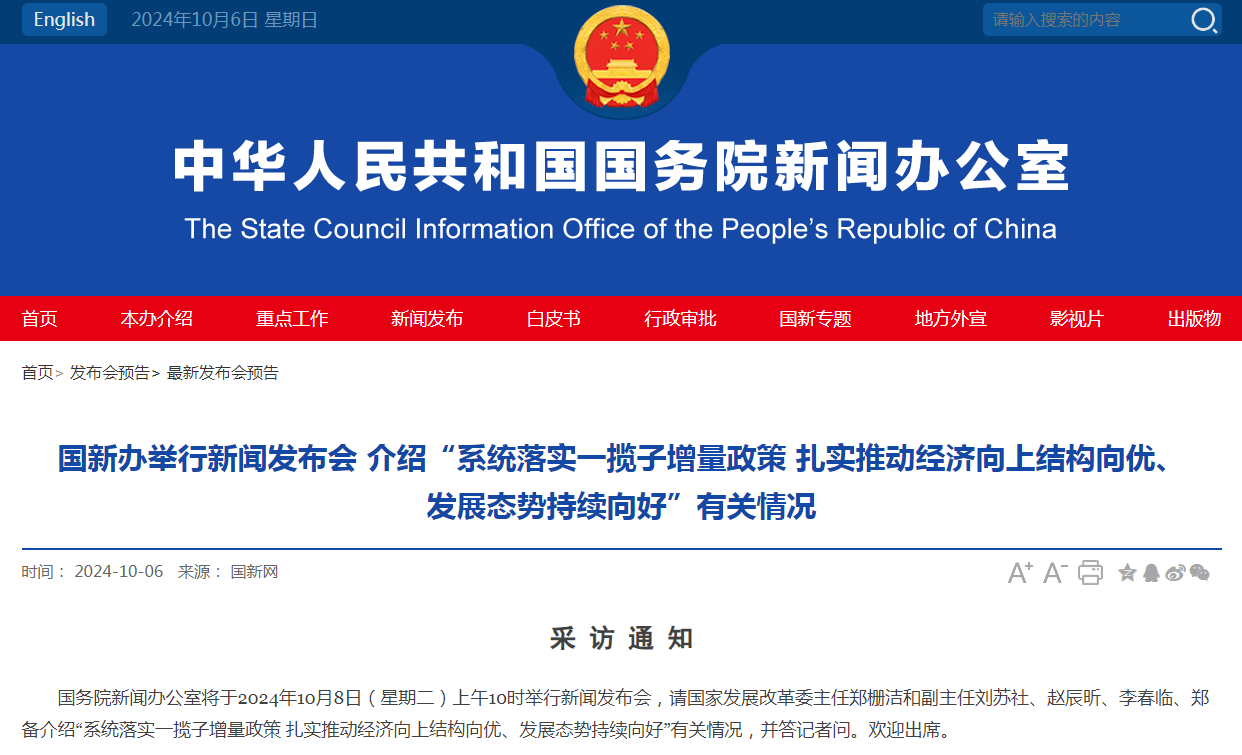 国务院新闻办公室定于2024年10月8日(星期二)上午10时举行新闻发布会,国家发展改革委主任郑栅洁和副主任刘苏社、赵辰昕、李春临、郑备介绍“系统落实一揽子增量政策扎实推动经济向上结构向优、发展态势持续向好”有关情况,并答记者问。