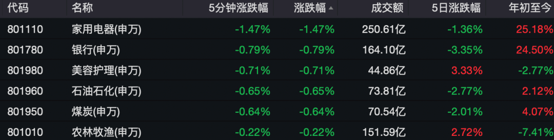早盘,消费股集体逆市下跌。家电指数跌逾1%,美容护理、农林牧渔等板块跌幅居前。