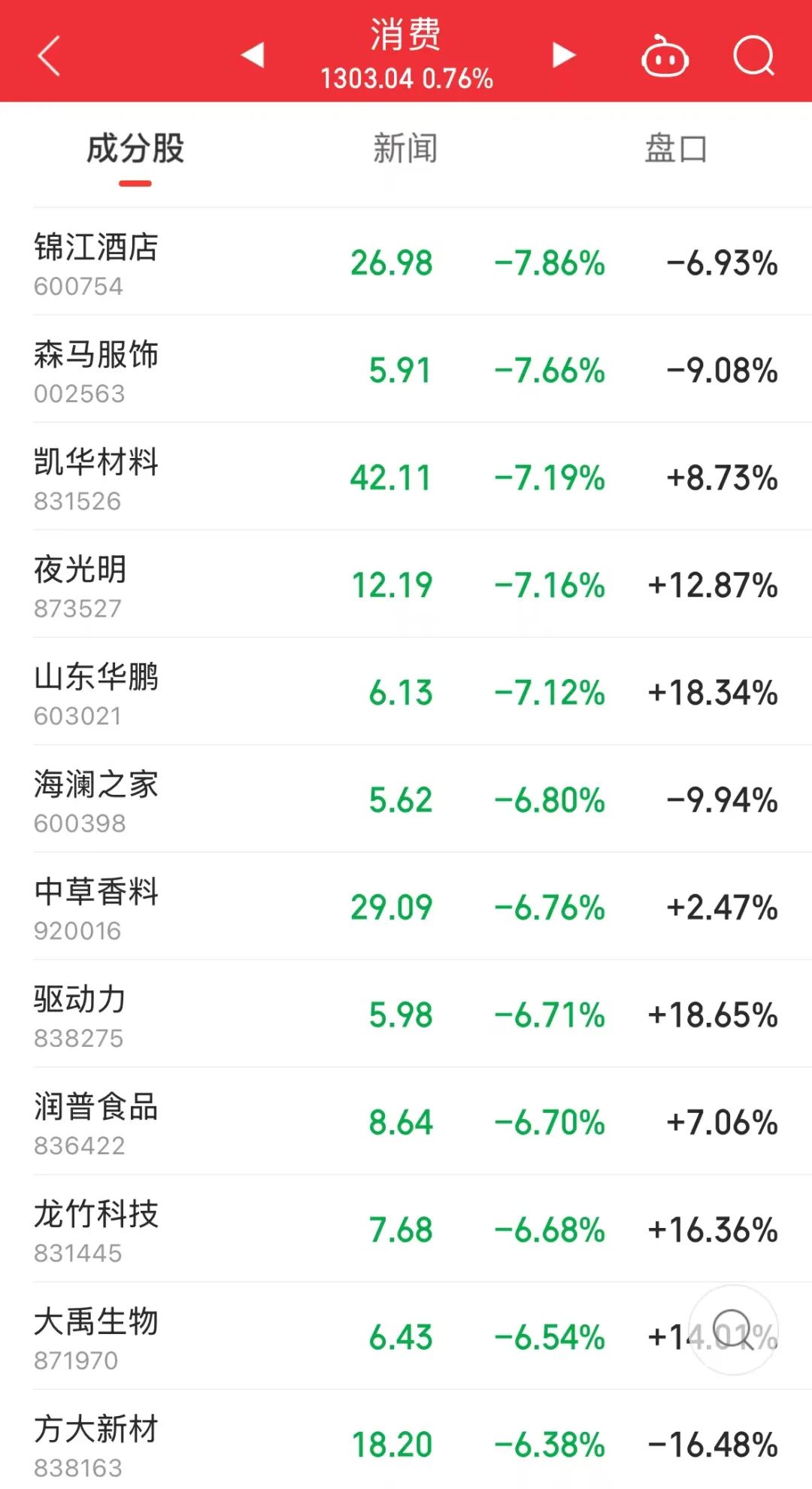 个股方面,锦江酒店跌近8%,森马服饰、海澜之家、九阳股份、洋河股份、格力电器、海信家电等个股均跌逾3%。