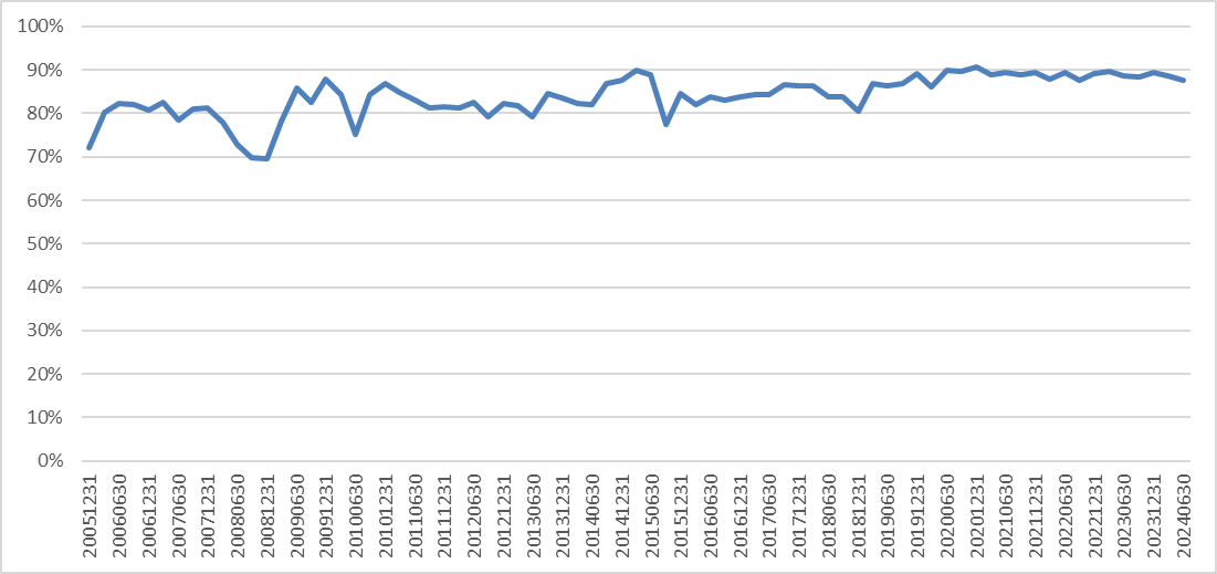 我们统计全市场主动权益基金的持股仓位变动情况,可以看到公募基金的持股行为,在过去20年维持在70%至90%的高仓位水平运作,是典型的长期资金行为模式。