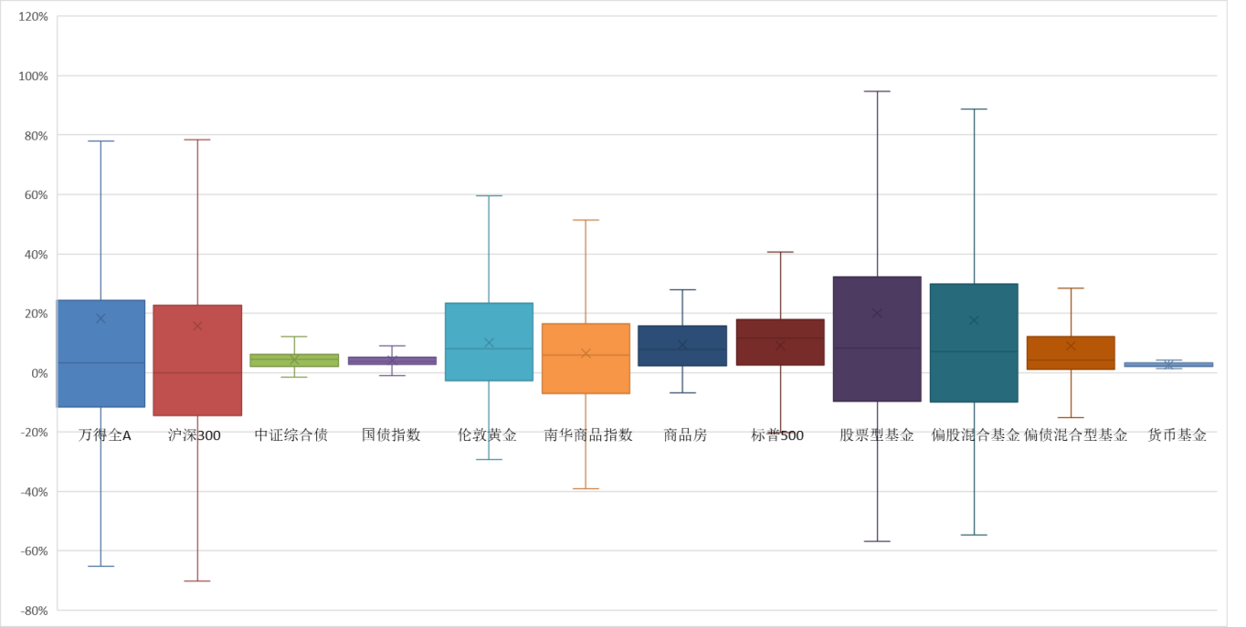 图:各类资产持有十年年化收益率分布