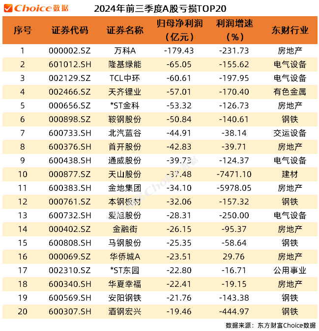 2024年前三季度,19家上市公司归母净利润亏损超过20亿元。