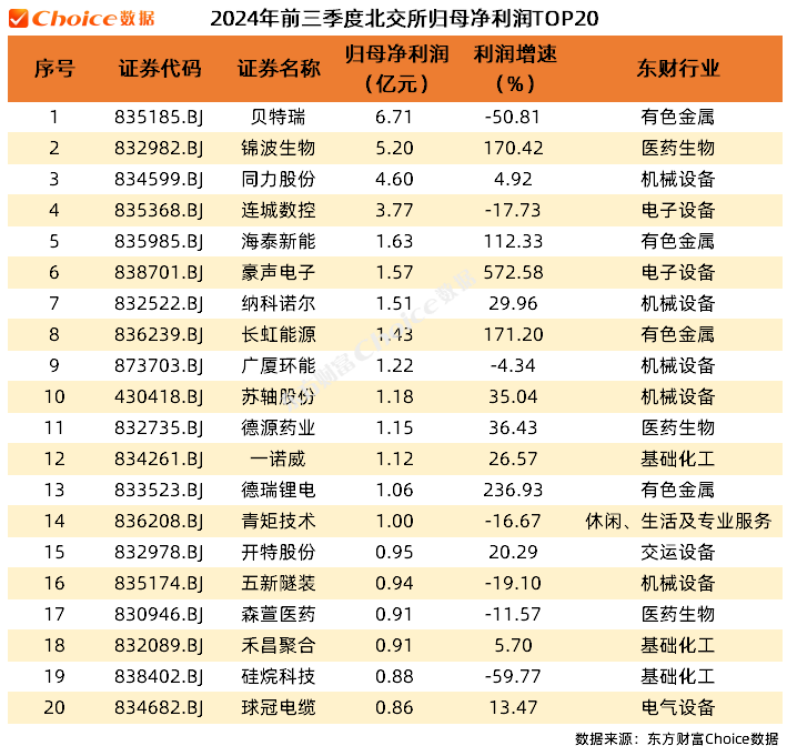 北交所归母净利润最高的是贝特瑞,共实现归母净利润6.71亿元;锦波生物、同力股份、连城数控归母净利润均在3亿元以上。