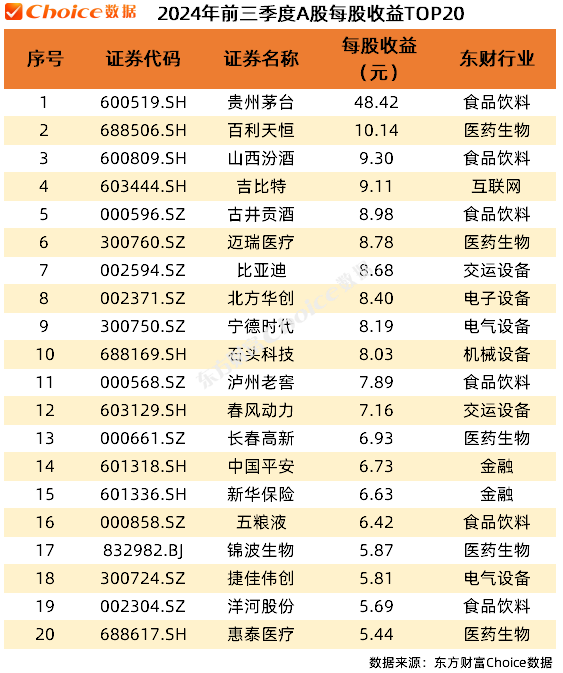 每股收益方面,2024年前三季度排名第一的是贵州茅台,基本每股收益为48.42元,百利天恒、山西汾酒和吉比特排名第二、第三、第四。