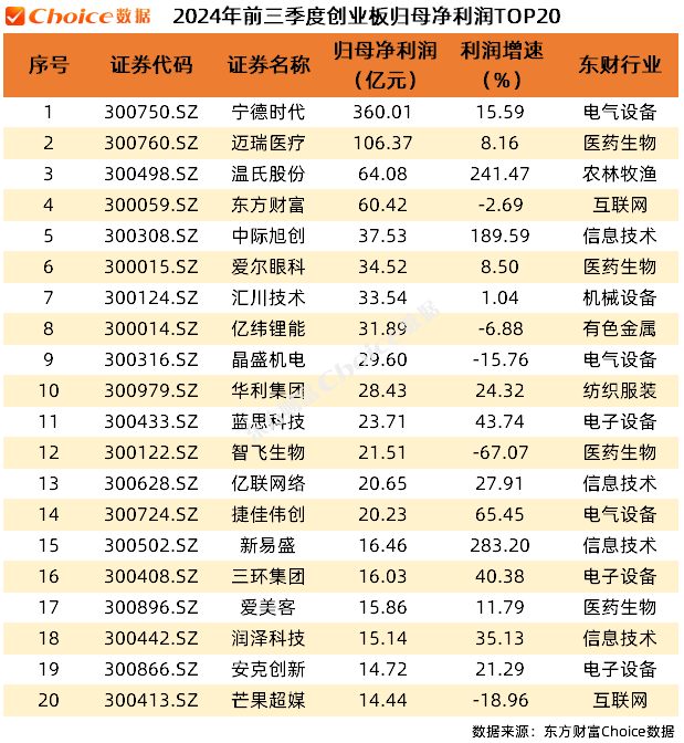 创业板方面,宁德时代以360.01亿元的归母净利润位居创业板2024年前三季度“盈利王”,迈瑞医疗、温氏股份位居第二、第三。