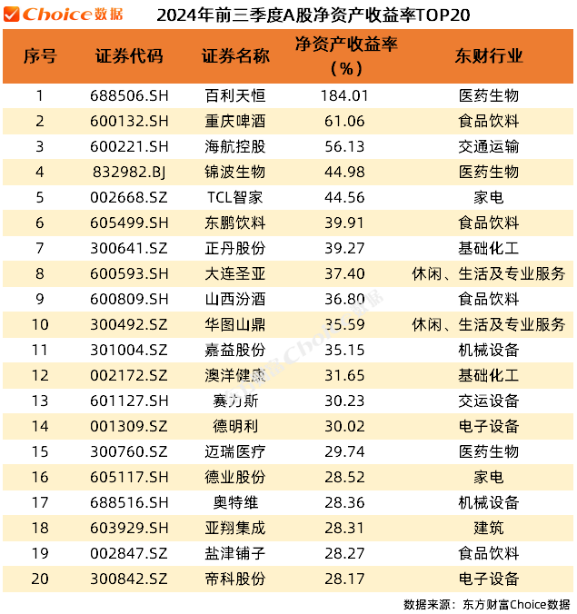 加权净资产收益率方面,排名前三的是百利天恒、重庆啤酒、海航控股。