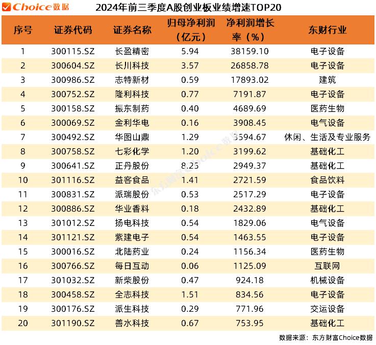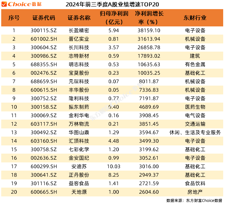 2024年前三季度,业绩增速最快的是长盈精密,达到38159.10%;晋亿实业、长川科技、志特新材、明志科技和宝莫股份业绩增速均超过10000%。
