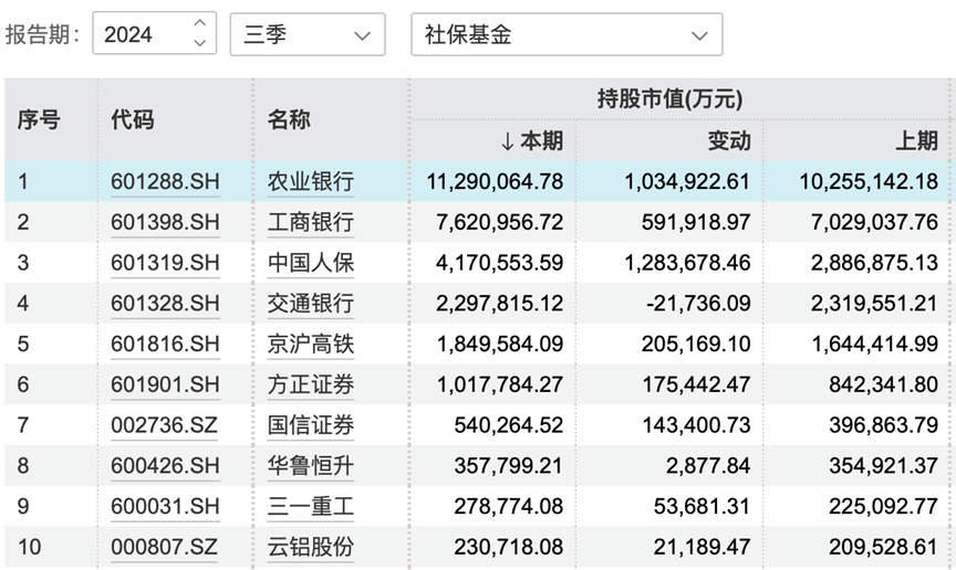 社保基金重仓股主要集中在银行、保险等大金融板块。农业银行、工商银行、中国人保、交通银行为社保基金前四大持仓股,持仓市值分别为1129.01亿元、762.1亿元、417.06亿元、229.78亿元。整体来看,能源、公用事业也是社保基金三季度持仓的重点方向,此外,大消费、制造业等方向亦获社保基金关注。
