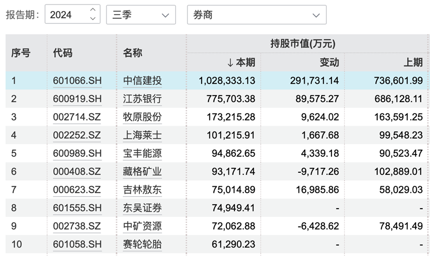此外,券商等机构三季报持股市值也较中报有所增加。
