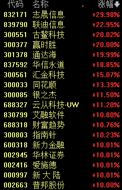 互联网金融板块掀起涨停潮,志晟信息迎来“30CM”涨停。证券板块中,第一创业、华林证券涨停。