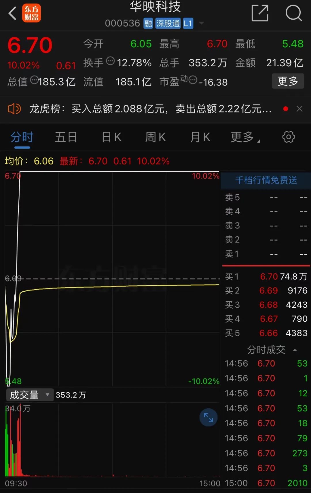 而在这2只股票之前,欧菲光早盘大幅低开之后,快速封死涨停。资金的态度再度点燃市场做多热情,早盘一度跌停的华映科技直线拉升涨停,走出7连板,上演“地天板”行情,成交超21亿元;松发股份也封板涨停,上演“地天板”,日内成交额超15亿元。跌停开盘的延华智能再度涨停,5个交易日内录得4个涨停,累计涨幅为31.94%,成交金额超9亿元。福日电子亦是如此走势。