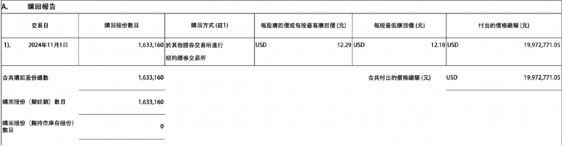 11月4日,阿里巴巴-W港股发布公告显示,该公司于2024年11月1日斥资1997.28万美元回购163.32万股股份,每股回购价格在12.18美元至12.29美元之间。