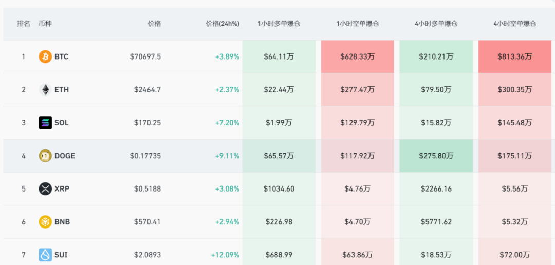 虚拟货币全线飙升。狗狗币大涨超9%,比特币大涨近4%,并站上70000美元/枚。