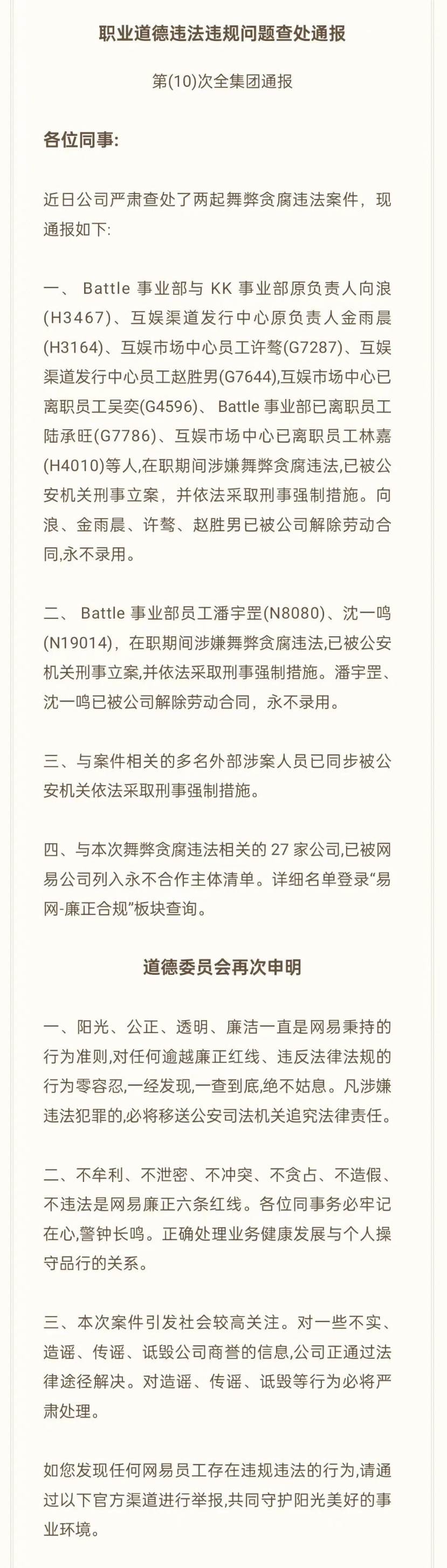 通告提到,与本次舞弊贪腐违法相关的27家公司,已被网易公司列入永不合作主体清单。