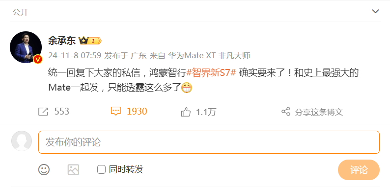 11月8日早间,华为常务董事、终端BG董事长、智能汽车解决方案BU董事长余承东在微博发文,鸿蒙智行家族新成员——智界新S7要来了,和“史上最强大的Mate”一起发,只能透露这么多了。