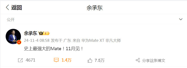 前几天,余承东发微博称,华为Mate 70系列将于11月正式亮相,并称这是“史上最强大的Mate”。