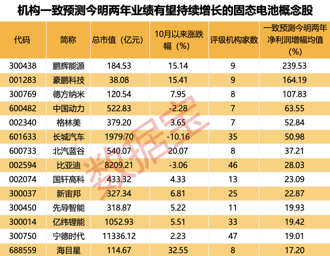 今年前三季度,固态电池板块业绩取得亮眼成绩,七成概念股盈利。从今年、明年两年的业绩预期来看,目前获得5家及以上机构评级的固态电池概念股中,有14股今年以及明年的业绩有望持续增长。