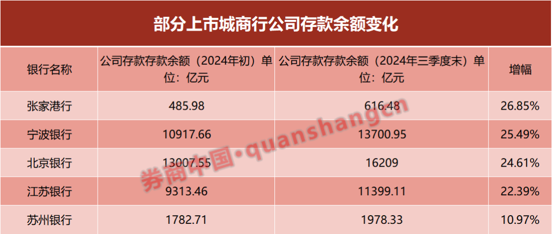 部分上市银行对公存款规模减少的同时,券商中国记者注意到,19家上市银行维持该指标较年初的增长。其中,张家港行、宁波银行、北京银行、江苏银行、苏州银行等城商行对公存款规模增速亮眼,均较年初实现双位数增长,增幅分别达26.85%、25.49%、24.61%、22.39%、10.97%。