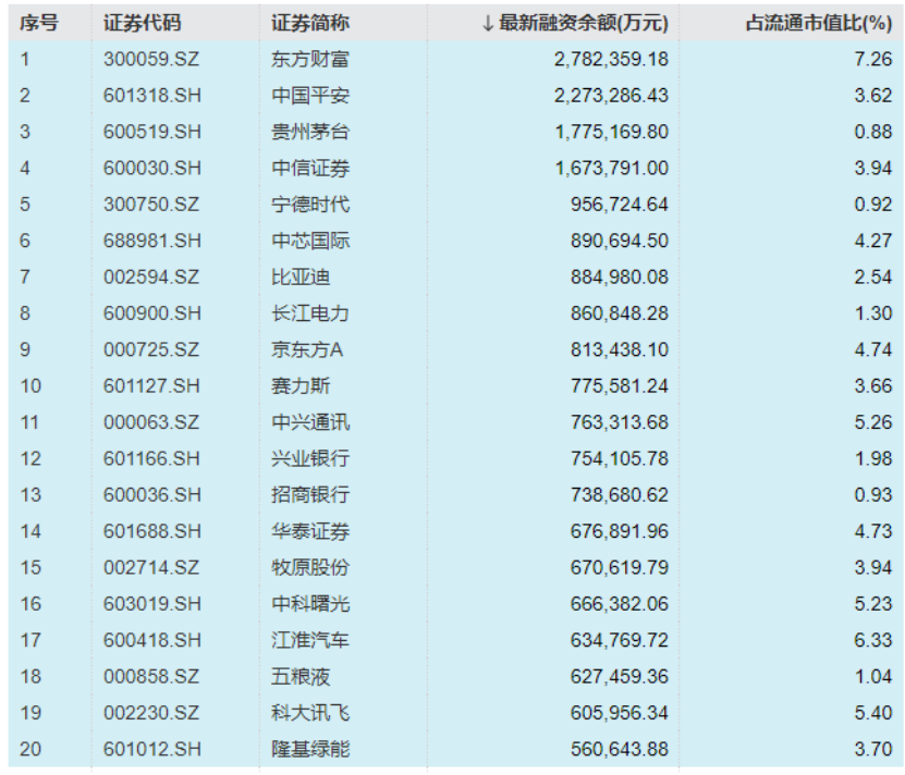 其中,融资余额最高的前十大个股包括:东方财富、中国平安、贵州茅台、中信证券、宁德时代、中芯国际、比亚迪、长江电力、京东方A、赛里斯等。