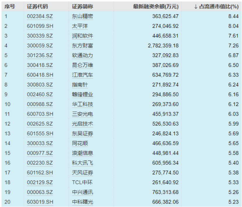 目前,融资余额占流通市值比例最高的前十个股包括:东山精密、太平洋、润和软件、东方财富、软通动力、昆仑万维、江淮汽车、指南针、赣锋锂业、华工科技等。