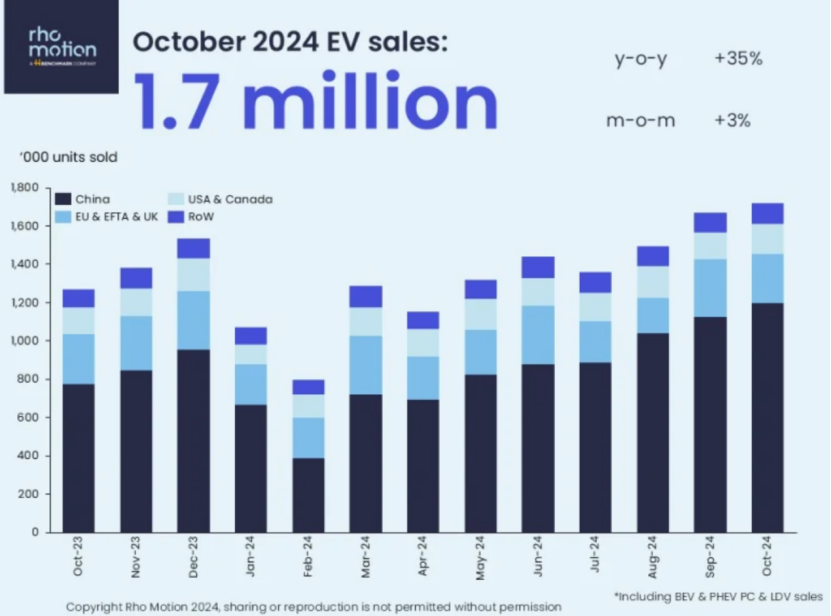 对此之下,欧洲市场则相对疲软,该地区10月份的电动汽车销量为26万辆,同比略有上升,但环比9月份下降了14%;在全球其他地区,电动汽车销量同比增长了10.9%。