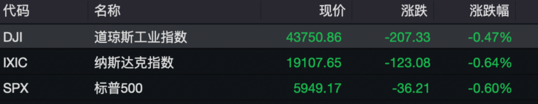 当地时间11月14日(周四),美股三大股指悉数下挫。截至收盘,道指跌207.33点,跌幅为0.47%,报43750.86点;纳指跌123.07点,跌幅为0.64%,报19107.65点;标普500指数跌36.21点,跌幅为0.60%,报5949.17点。