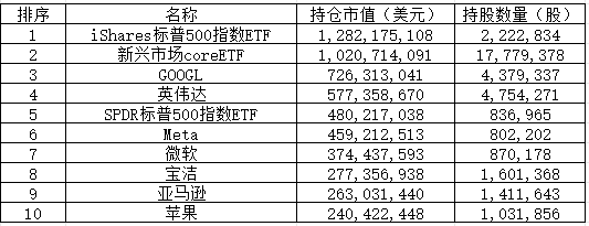 在前十大重仓股中,iShares标普500指数ETF以12.8亿美元持仓市值排名首位,持仓数量较二季度末小幅增加5.77%;新兴市场coreETF、谷歌母公司Alphabet分别以10.2亿美元、7.26亿美元持仓市值排名第二、三位。英伟达、SPDR标普500指数ETF、Meta、微软、宝洁、亚马逊、苹果分列第四至第十位。