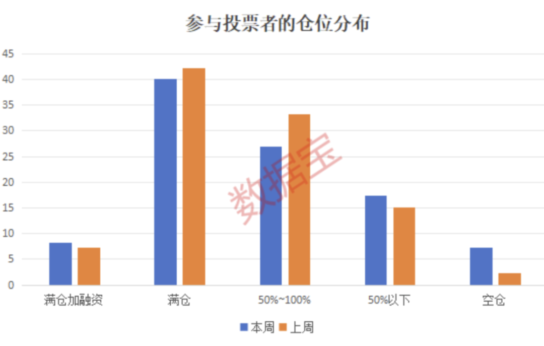 具体来看,满仓和满仓加融资的两类受访者合计48.27%,较上一期的49.39%有所下降;持仓50%~100%的比例也较上期减少6.18个百分点。