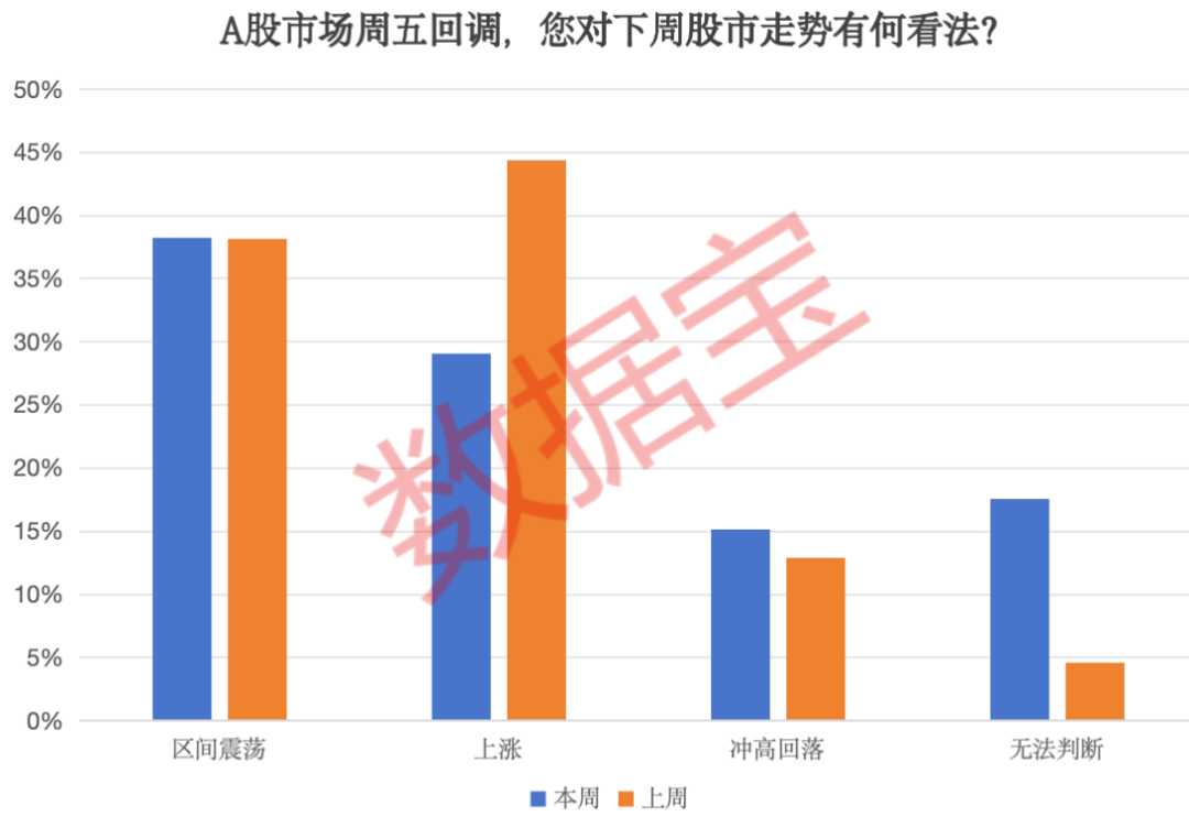 本次调查结果显示,大盘经过上周下跌后,仅29%的受访者表示本周将上涨,较上周44.41%的比例,大幅下降15个百分点,受访者情绪有所回落。