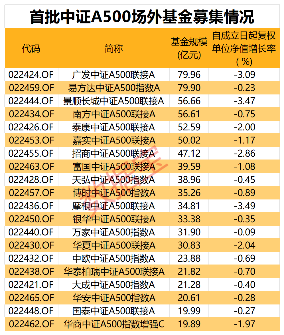 除外,上周随着银华基金宣布银华中证A500ETF联接基金成立,首批中证A500场外基金募集情况正式揭晓。首批20只中证A500场外基金共“吸金”达795.07亿元,接近800亿元。