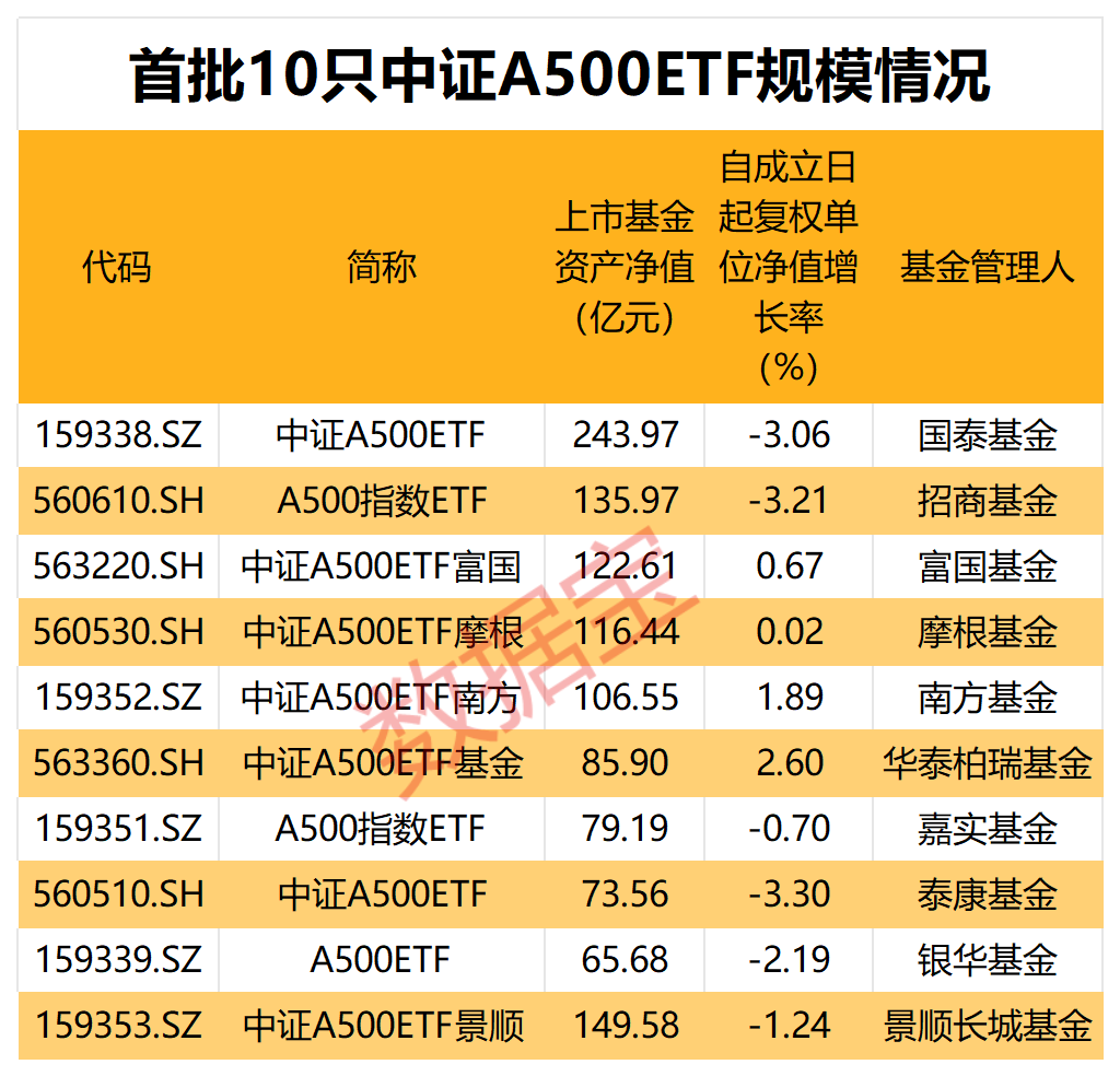 其中,已上市的首批10只中证A500ETF规模超过1170亿元。其中,国泰基金、招商基金、景顺长城基金、富国基金、摩根基金、南方基金旗下的中证A500ETF规模已突破100亿元。