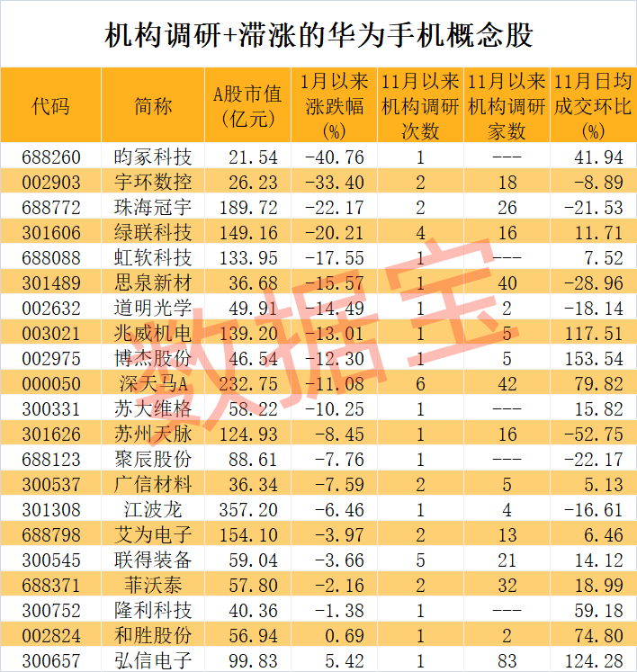 在上述滞涨的华为手机概念股当中,11月以来获得机构调研的有21只。机构调研最频繁的3只股票是深天马A、联得装备、绿联科技,分别达到6次、5次、4次。