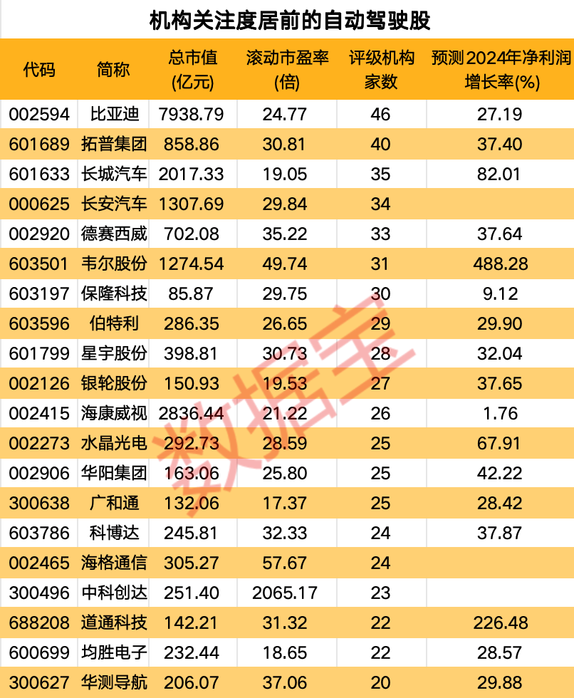 证券时报·数据宝对A股自动驾驶概念进行梳理,筛选出其中机构关注度高(20家及以上机构参与评级)的个股,共计20只。比亚迪、拓普集团、长城汽车、长安汽车机构关注度排名前四,分别有46家、40家、35家、34家机构参与公司评级。