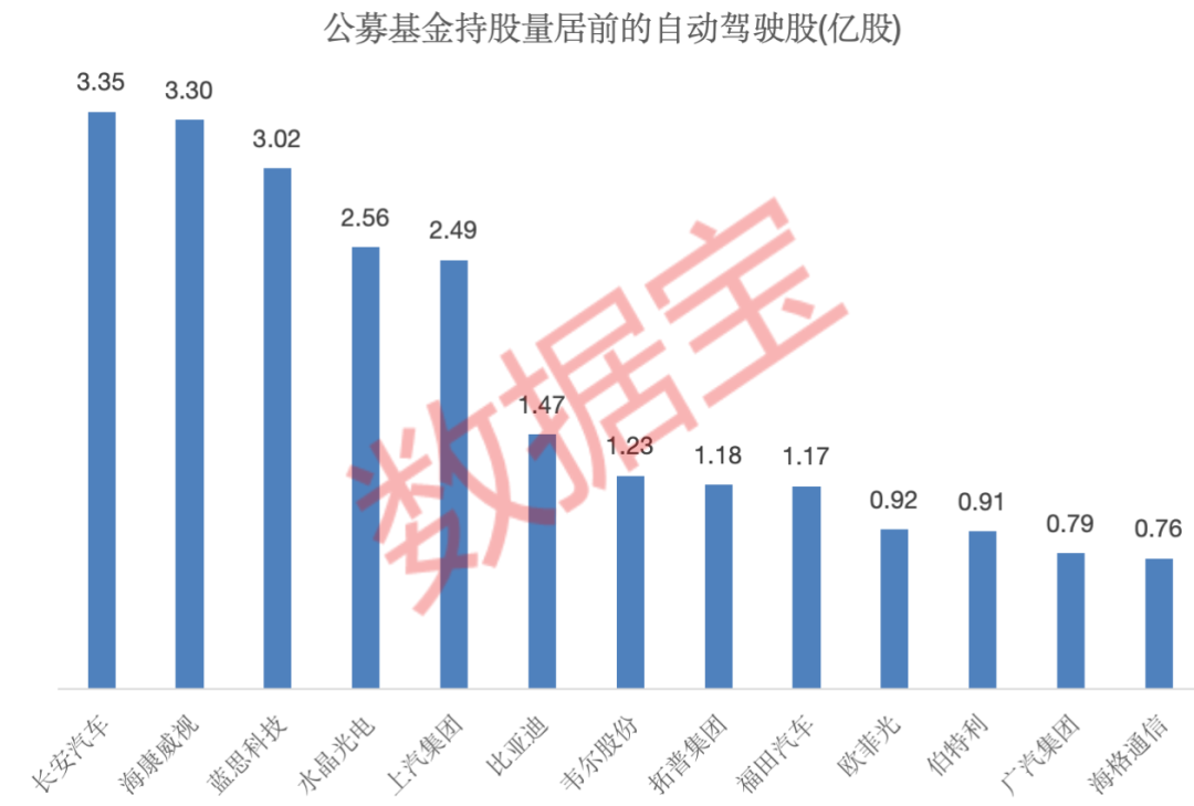 多只无人驾驶概念股获得公募基金重仓。根据机构公布的第三季度持仓数据,长安汽车、海康威视、蓝思科技、水晶光电和上汽集团5股公募基金持股量居前,依次为3.35亿股、3.3亿股、3.02亿股、2.56亿股、2.49亿股。
