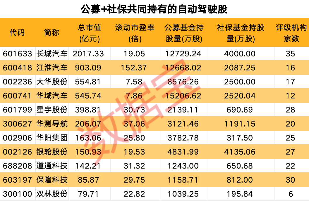 与此同时,部分个股也获得社保基金青睐。数据宝统计,公募、社保共同持有的个股有11只。从总量上来看,4只500亿元以上市值个股持股量均过亿,最高的是华域汽车,持股量达到1.77亿股。公司是目前国内业务规模最大的综合性汽车零部件上市公司,未来随着客户结构多元化以及费用端管控精细化,盈利中枢有望保持稳定。