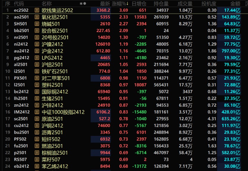 今天早盘,最亮眼的不是股票,而是期货。内盘期货主力合约集运欧线一度涨达3.65%,该合约从9月份以来已经翻倍。同时,氧化铝、烧碱、胶合板涨超2%,沪镍、沪金、沪铝、铁矿涨超1%。