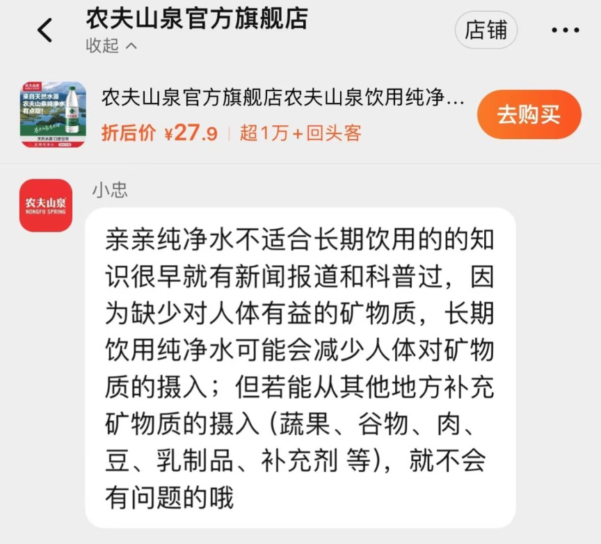 从上述客服表态来看,“不建议长期喝纯净水”的论调仍有待商榷,一是“长期饮用纯净水可能会减少人体对矿物质的摄入”中的“可能”;二是“若能从其他地方补充矿物质的摄入(蔬果、谷物、肉、豆、乳制品、补充剂等),就不会有问题的”。