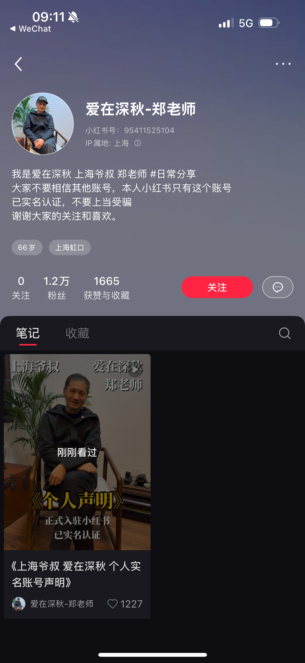 11月21日,记者从小红书获悉,开设个人账号需实名认证,但是否系上海爷叔“爱在深秋”本人开设账号“爱在深秋-郑老师”,暂无法确认。